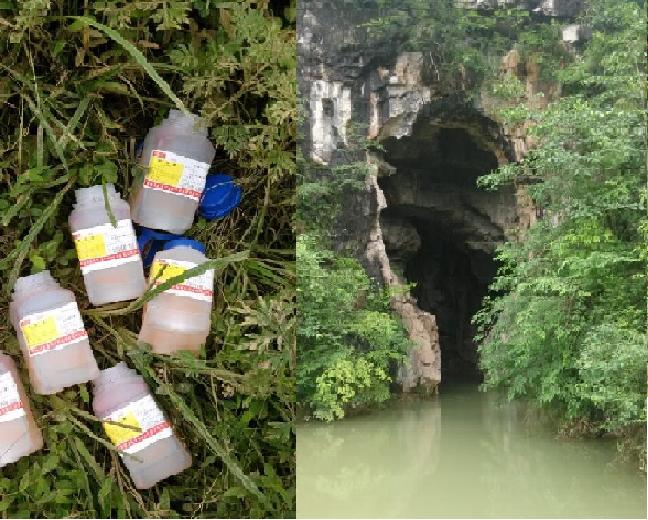 芭蕉院隧道为贵州省三穗至施秉高速公路控制线路工程的长大隧道,隧道为双线分修四车道隧道工程,全长3550m,隧道最大埋深约200m。隧道洞身主要穿越奥陶系大湾组中厚层状砂质石灰岩、泥质石灰岩及钙质页岩、寒武系炉山组浅灰、灰白色块状细至中粒白云岩,隧道出口段上覆上第三系紫红色、灰绿色泥质及钙质泥岩。测区岩层产状平缓,岩层倾角为10°~20°。工程位于上扬子板块西南缘的一个东西向黔中隆起带,受镇远-贵阳区域断裂带影响,岩体节理裂隙发育。地表落水洞、岩溶洼地发育。隧道地表泉水、落水洞、岩溶洼地、地下岩溶暗河发育。调查时发现在下翁哨村发育一落水洞的暗河入口,在皂角屯村附近发育有一岩溶暗河出口。为了调查其连通性。我们安排了示踪物来进行地下暗河连通试验。地下暗河连通试验是查明岩溶地区水文地质条件(包括地下水的补给条件、迳流特征、排泄方式)的重要手段之一。它对于研究和评价岩溶地区特别是水文地质条件复杂且难以查清的岩溶地区的岩溶裂隙——管道水具有重要的意义。