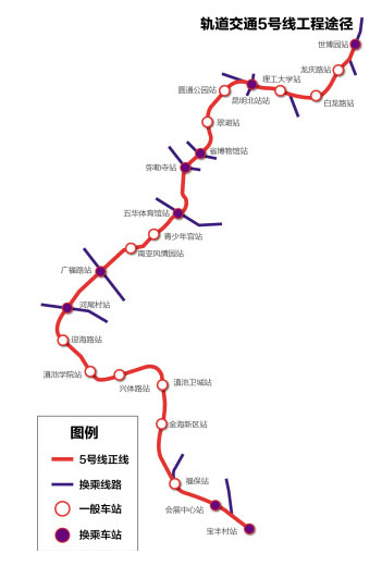 轨道交通5号线工程途经盘龙区、五华区、西山区、度假区和官渡区。串联了昆明世博园、圆通山、翠湖、滇池度假区等昆明的旅游精品区。