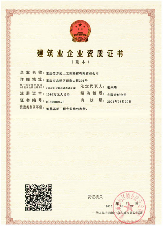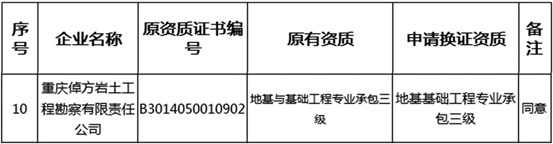 根据《建筑业企业资质管理规定》(建设部令第22号)、《关于印发〈建筑业企业资质管理规定和资质标准实施意见〉的通知》(建市〔2015〕20号)、《建筑业企业资质标准》(建建〔2014〕159号)和《关于换发新版建筑业企业资质证书的通知》(建办市函[2015]870号)的有关规定,经企业申报,城乡建委对近期申请资质换证的重庆市重庆倬方岩土工程勘察有限责任公司等12家企业换证资料进行了核实,其符合资质换证条件要求,现予以公布。
