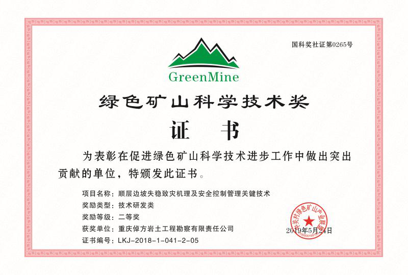 2019年5月24日至26日,第二届(2019年)绿色矿业发展大会暨2018年度绿色矿山科学技术奖颁奖大会在重庆召开。由西南石油大学、中国建筑西南勘察设计研究院有限公司、西南科技大学、中防通用电信技术有限公司、重庆倬方岩土工程勘察有限责任公司、四川省地质工程勘查院等为合作单位,完成的“顺层边坡失稳致灾机理及安全控制管理关键技术”获得技术研发类二等奖。