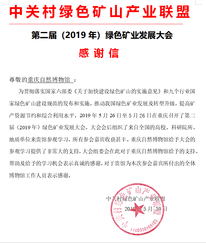 致重庆自然博物馆的感谢信
