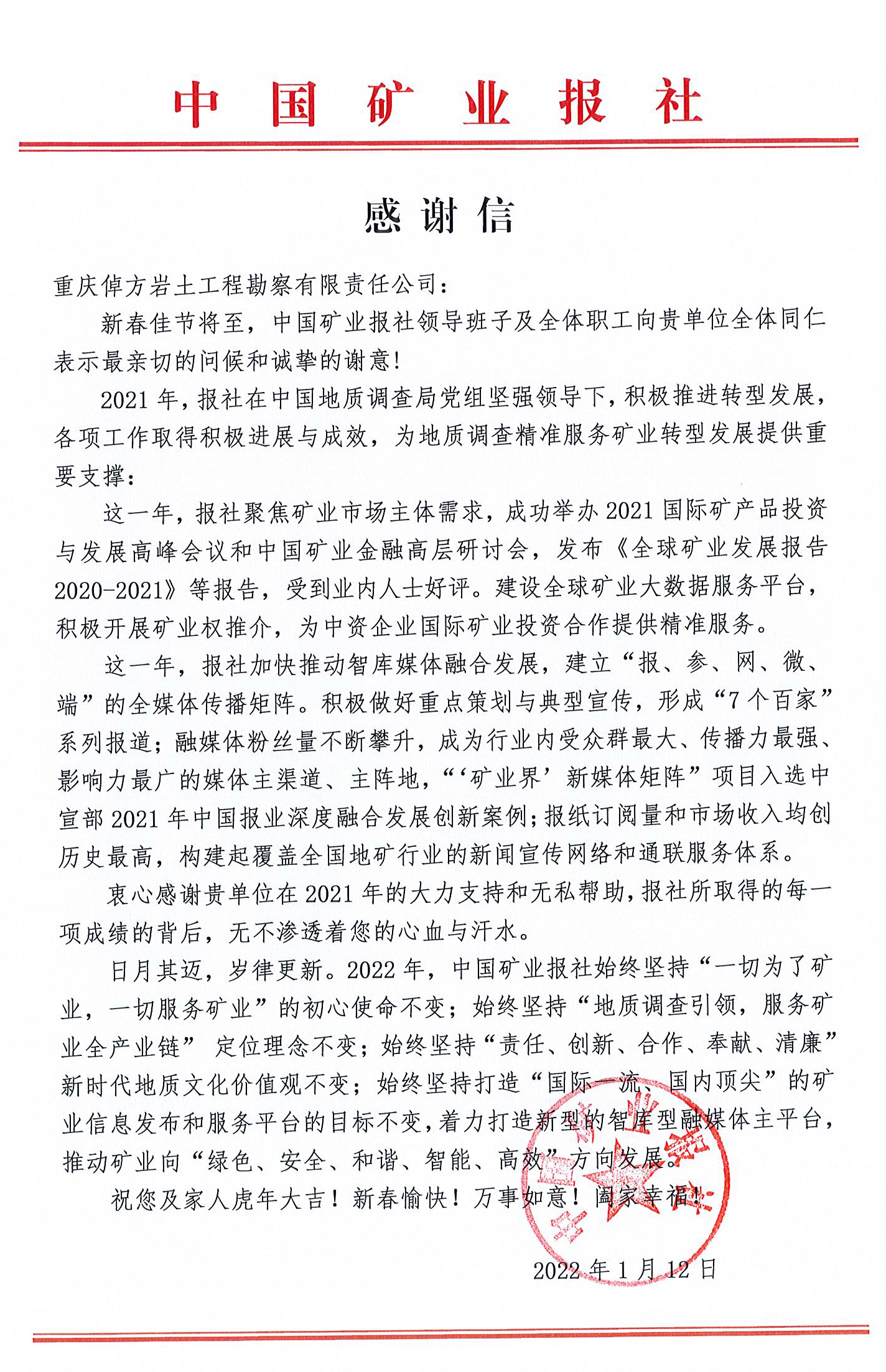 新年伊始,“倬方钻探工程集团公司”收到了一封来自《中国矿业报》的热情洋溢的“感谢信”。这声温馨的问候,沁人心脾、感人肺腑,也是对我们“中国矿业报重庆融媒体中心工作站”工作的肯定。